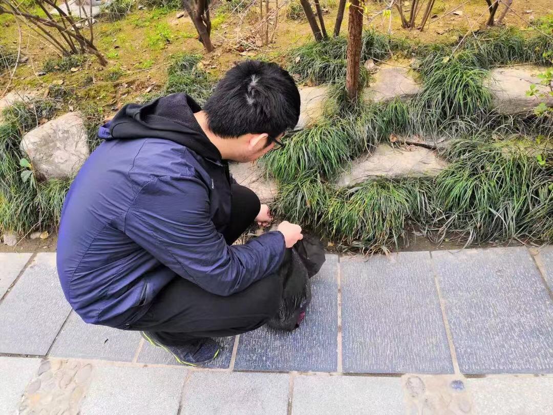 上午九点半,志愿活动正式开始,七名同学分为三个小组由北门出发,开始了对烟头与垃圾的清理。三月初春,公园里来来往往有许多运动、拍照的人,有许多烟头正是从他们这里“走丢”的。